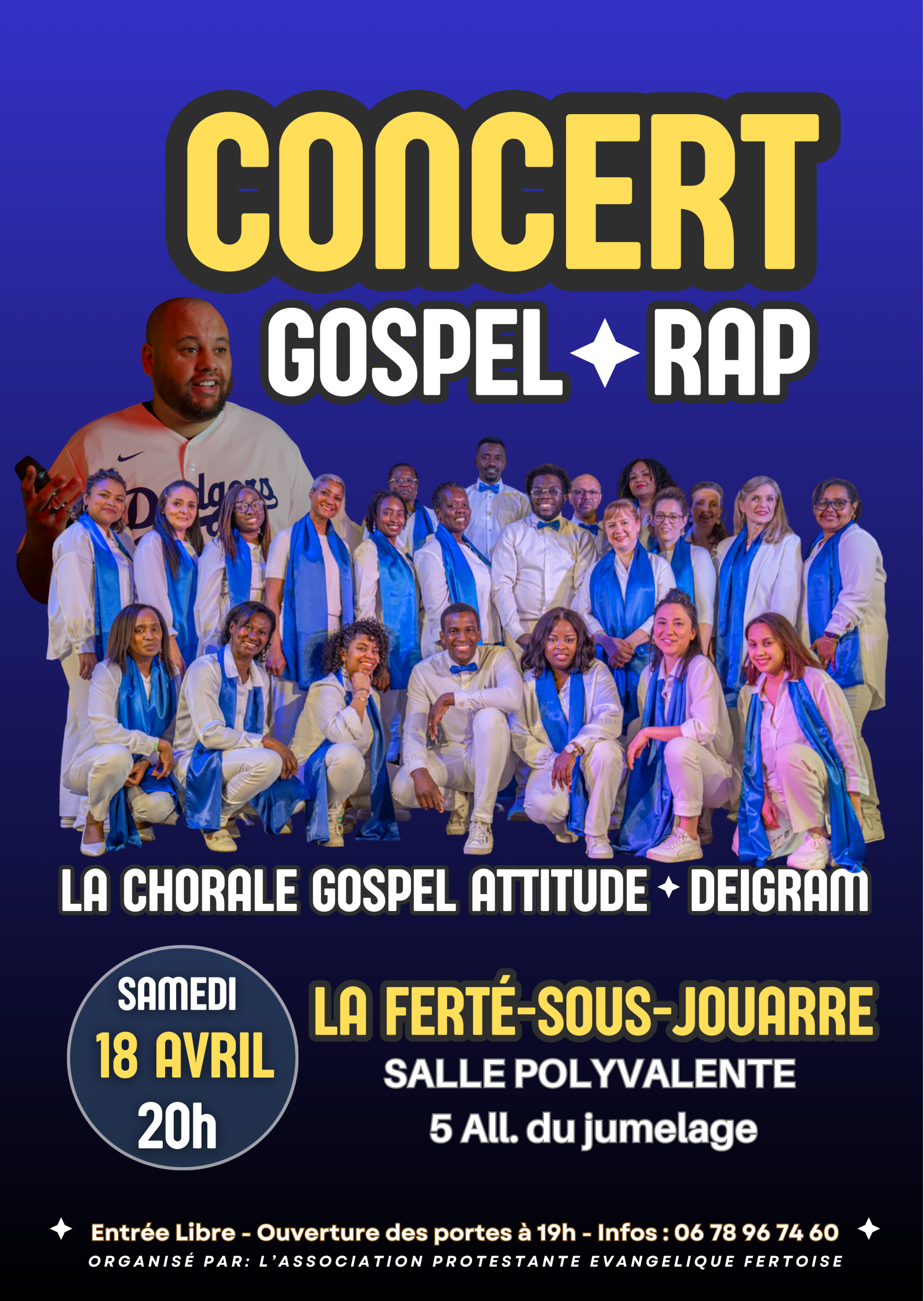 Ne manquez pas notre concert de gospel de printemps, avec un ensemble vocal et un rappeur le 18 avril 2026 à 20h00 dans la salle polyvalente de la ville. Une soirée d'adoration et de musique inspirante.